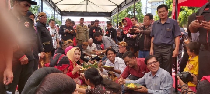 PURBALINGGA, WAWASANCO- Bupati Dyah Hayuning Pratiwi (Tiwi) bersama Ketua DPRD HR Bambang Irawan berbaur bersama warga untuk makan tumpeng bersama. Kegiatan itu dilaksanakan usai prosesi Pahargyan Agung dan Kirab Pusaka dalam peringatan Hari Ulang Tahun (HUT) Kabupaten Purbalingga ke 189, Rabu (18/12).