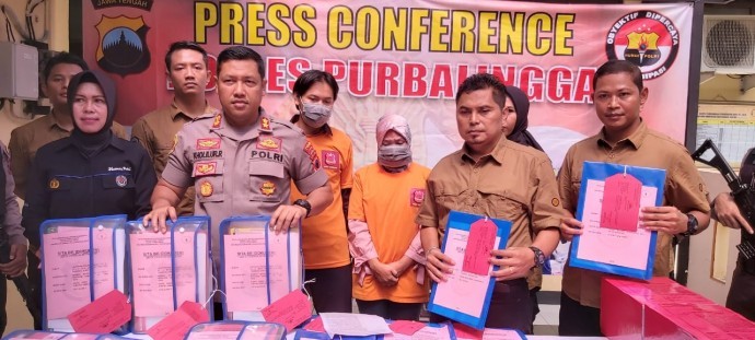 Kapolres Purbalingga AKBP Kholilur Rochman didampingi Kasat Reskrim AKP Wlly Budiyanto menunjukkan barang bukti bersama tersangka kasus dugaan korupsi penyalahgunaan keuangan Desa Arenan, Kecamatan Kaligondang, Kamis (26/12). (Foto :Joko Santoso)