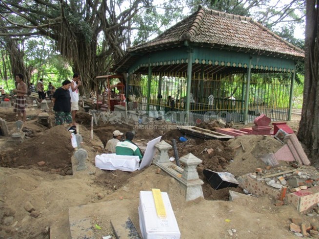Pelaksanaan pembongkaran makam di TPU Putri Cempo Surakarta yang dibiayai APBD Surakarta tahun 2017.Nampak bangunan cungkup makam Putri Cempo yang masuk katagori bangunan cagar budaya (Bagus Adji W)