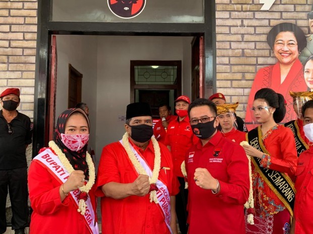 Ketua DPC PDIP Purbalingga HR Bambang Irawan bersama pasangan Dyah Hayuning Pratiwi-Sudono dalam acara penyerahan rekomendasi DPP PDIP di DPD PDIP Jateng, Rabu (2/9). (Foto :istimewa)