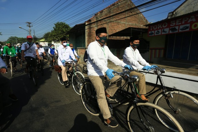 PURBALINGGA, WAWASANCO-Pasangan Muhamad Sulhan Fauzi, Oji dan Zaini Makarim Supriyatno (Oji-Jeni) Minggu (6/9) mendaftarkan diri ke Komisi Pemilihan Umum (KPU) Purbalingga. Pasangan Oji-Jeni berangkat dari depan kantor Pimpinan Cabang Nahdatul Ulama (PC NU) Purbalingga. Mengenakan hem warna putih dipadu celana krem, kedua alumni SMAN I Purbalingga ini naik sepeda ontel diiringi partai pendukung, relawan dan simpatisan mengular sejak dari PCNU hingga kantor KPU.