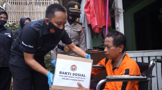 "Untuk Polres Purbalingga menggelar bakti sosial pemberian bantuan sembako untuk masyarakat terdampak Covid-19 diantaranya tukang becak, warga kurang mampu dan warga sakit menahun," ucapnya.
