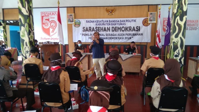 Kepala Bakesbangpol Kabupaten Banyumas Drs. Setia Rahendra, M.Si mengatakan saresehan demokrasi sasarannya adalah pemilih mileneal. Menurutnya pemilih milenial harus pahami pentingnya Pemilu. Ia memilih anggota Pramuka kurang lebih 70 orang, karena anggota Pramuka pada saatnya bisa menjadi agen perubahan dalam pelaksanaan demokrasi di Kabupaten Banyumas.