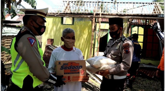 PURBALINGGA, WAWASANCO- Satuan Lalu Lintas (Satlantas) Polres Purbalingga menggelar kegiatan bakti sosial bertajuk Polantas Peduli, Sabtu (7/11/2020). Kegiatan dilaksanakan di Desa Muntang, Kecamatan Kemangkon dengan sasaran para korban bencana alam angin ribut.