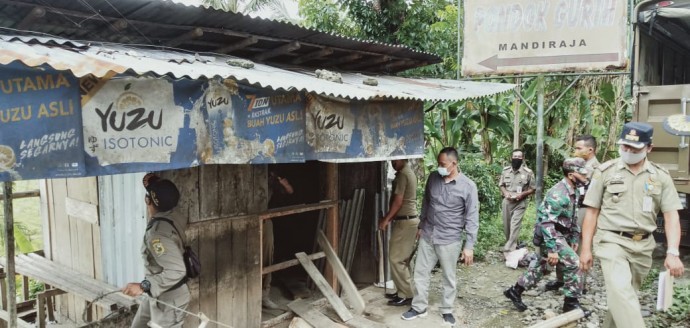BANJARNEGARA, WAWASANCO Satpol PP bersama Forkompinca Purwareja Klampok, Senin (4/1/2021) melakukan pembongkaran sebuah unit kios bangunan semi permanen yang berada di sepadan jalan nasional Klampok Banjarnegara. Bangunan berukuran 4x5 meter tersebut diketahui milik LM, warga Kedungjati, Bukateja Purbalingga. Selain tidak memiliki IMB, tempat tersebut juga digunakan untuk berjualan minuman beralkohol jenis tuak.
