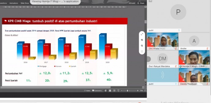 "Perolehan tersebut, membuktikan bahwa fungsi intermediasi CIMB Niaga tetap terjaga. Kami dapat melewati tahun yang penuh tantangan dengan kinerja KPR yang optimal. Hal ini merupakan hasil dari upaya berkelanjutan yang kami lakukan, dalam menghadirkan produk dan layanan yang sesuai kebutuhan nasabah," papar Mortgage & Secured Loan Business Head CIMB Niaga, Heintje Mogi dalam Diskusi Bersama CIMB Niaga yang dilaksanakan secara virtual di Jakarta, Kamis (18/3/2021).