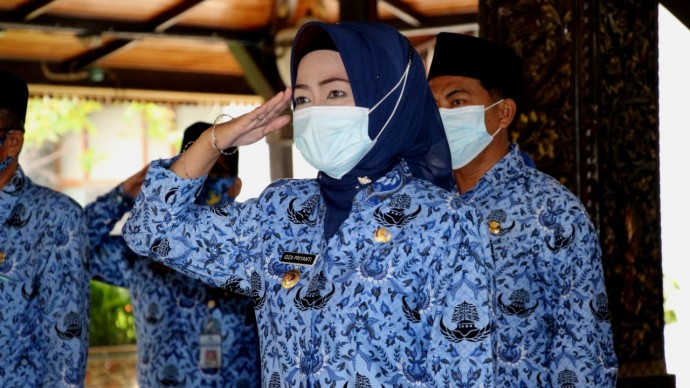 BREBES, WAWASANCO - Bupati Hj Idza Priyanti SE MH mengikuti upacara Hari Kebangkitan Nasional (Harkitnas) ke-113 secara virtual di Pendopo Kabupaten Brebes, Kamis (20/5).