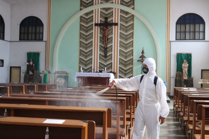 Petugas Polres Banjarnegara melakukan penyemprotan disinfektan di salah satu tempat ibadah. (Foto :Dok)