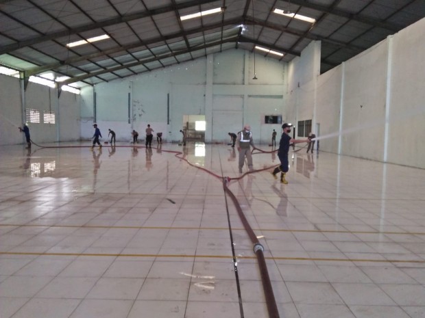 MENYEMPROTKAN : Sejumlah petugas Damkar Kota Salatiga saat melakukan pembersihan di Eks pabrik ban Mega Rubber, belum lama ini. Foto : Ernawaty
