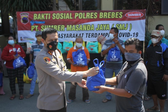 KapolresAKBP Faisal Febrianto SIK MSi kepada wartawan di Mapolres Brebes mengemukakan, pihaknya hari ini secara simbolis telah menyerahkan bantuan paket sembako kepada perwakilan PKL yang biasa berjualan di Alun–Alun Brebes.