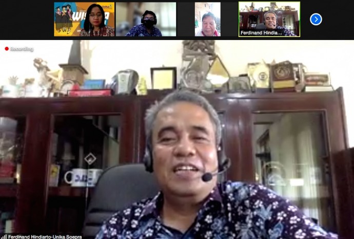 DISKUSI : Rektor Unika, Dr Ferdinandus Hindiarto SPsi MSi, saat berdiskusi dengan awak media secara virtual, terkait persiapan pelaksanaan wisuda periode III 2021 kampus tersebut, Rabu (15/9/2021).