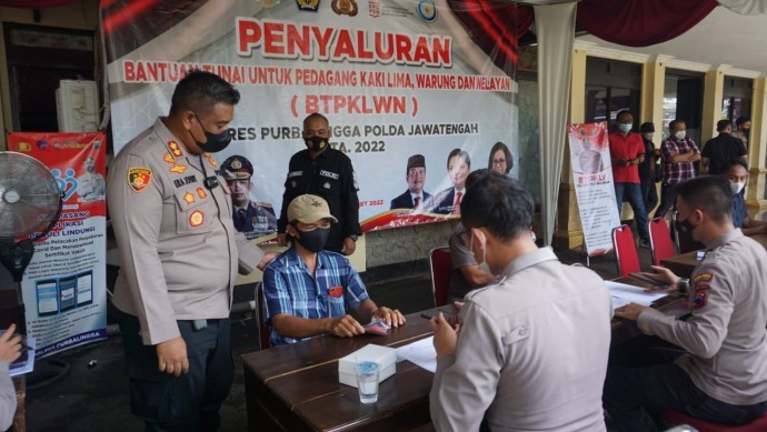 PURBALINGGA, WAWASANCO - Polres Purbalingga mulai menyalurkan Bantuan Tunai Pedagang Kaki Lima Warung dan Nelayan (BTPKLWN) bagi masyarakat yang berhak menerima. Penyaluran dilaksanakan di Mapolres Purbalingga mulai Kamis (24/3/2022).
