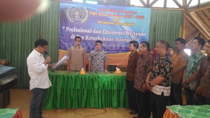 SALATIGA- Ketua PWI (Persatuan Wartawan Indonesia) Provinsi Jawa Tengah, Amir Machmud NS melantik Pengurus PWI Kota Salatiga di Rumah Makan Banyubening, Salatiga, Rabu (20/12). Mereka yang dilantik adalah Ketua Surya Yuli Purwariyanto (Suara Merdeka), Wakil Ketua I Edy Susanto (KR), dhinas Sasongko (Radar Jawa Pos), Sekretaris 1 Riswanto (Radio Zenith), Sekretaris 2 Aloysius Jarot (LKBN Antara), Bendahara I Dekan Bawono (Jateng Pos), Bendahara 2 Agung Nugroho, dibantu seksi-seksi.