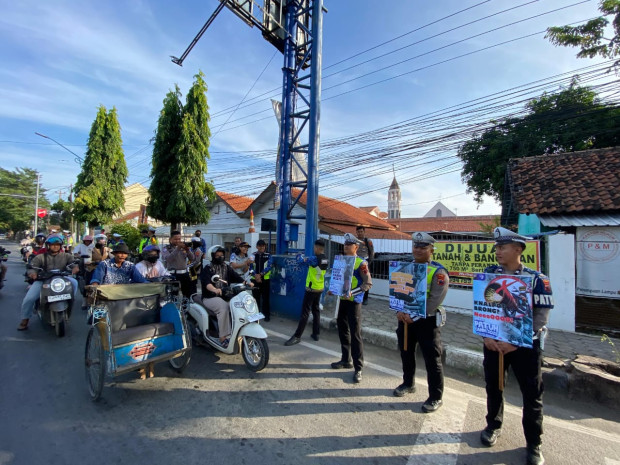 Dalam kegiatan tersebut, petugas membentangkan spanduk sosialisasi dan menyampaikan edukasi secara langsung kepada para pengendara kendaraan bermotor. Mereka memberikan imbauan pentingnya tertib berlalu lintas sebagai bagian dari upaya menciptakan keselamatan di jalan raya menuju Indonesia Emas 2045.