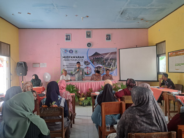 MUSYAWARAH ORANG TUA : Kepala SMP Negeri 3 Wanasari, Danang Margono MPd membuka acara Musyawarah Orang Tua Kelas VII yang diadakan di aula sekolah setempat, Sabtu (4/10/2025). Foto. Eko Saputro/wawasan.co