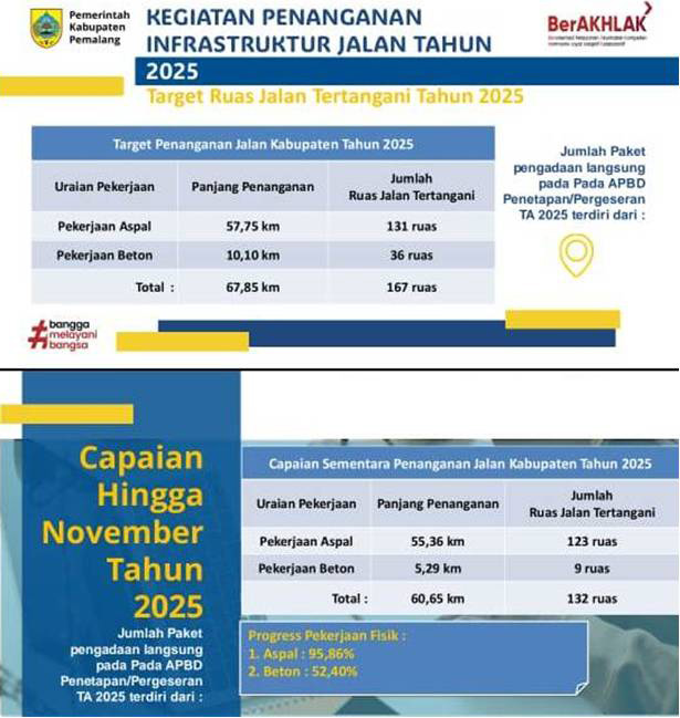Sementara itu berdasarkan data yang dipaparkan Dinas Pekerjaan Umum dan Tata Ruang (DPUTR) Bidang Bina Marga Kabupaten Pemalang saat dialog interaktif di LPPL Radio Widuri sebelumnya disampaikan bahwa,