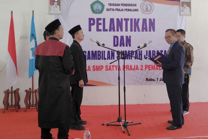 LANTIK - Ketua Yayasan Pendidikan Satya Praja melantik Nur Alim menjadi Kepala Sekolah SMP 2 Satya Praja Pemalang. Foto : Probo