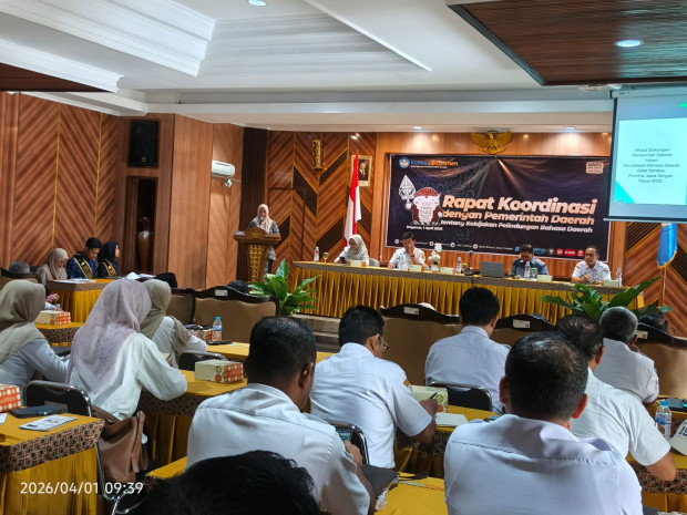 Ungaran, Wawasan.co - Balai Bahasa Provinsi Jawa Tengah atau BBPJT menyelenggarakan Rapat Koordinasi dengan Pemerintah Daerah/ pemda tentang Kebijakan Pelindungan Bahasa Daerah di Aula Cipto Mangunkusumo BBPJT, Kabupaten Semarang, pada Rabu, 1 April 2026. Rapat koordinasi ini digelar sebagai salah satu langkah pelestarian bahasa daerah, terutama dalam bidang pendidikan. Peserta yang hadir pada rapat kali ini adalah kepala atau perwakilan dinas pendidikan dari 35 kabupaten/kota di Jawa Tengah.