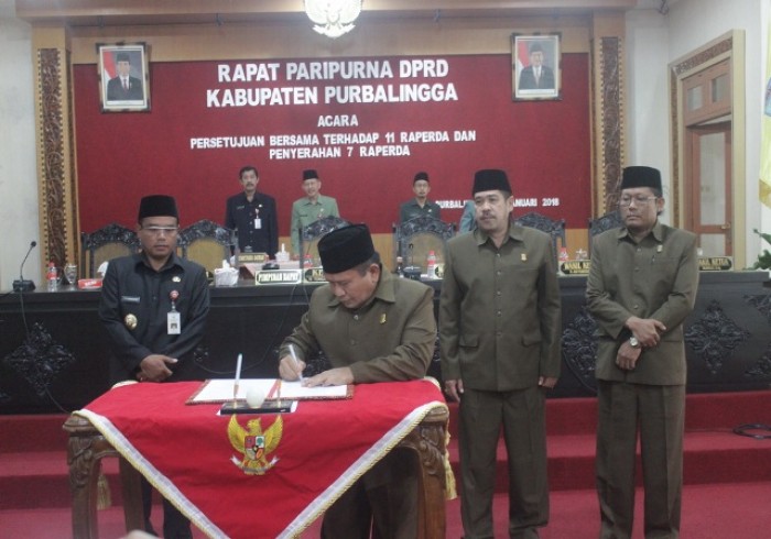 Ketua DPRD Purbalingga Tongat menandatangani penetapan 11 Raperda, Rabu (31/1). Salah satunya adalah Raperda tentang Pencegahan dan Penanggulangan HIV/AIDS. (Foto :Joko Santoso)