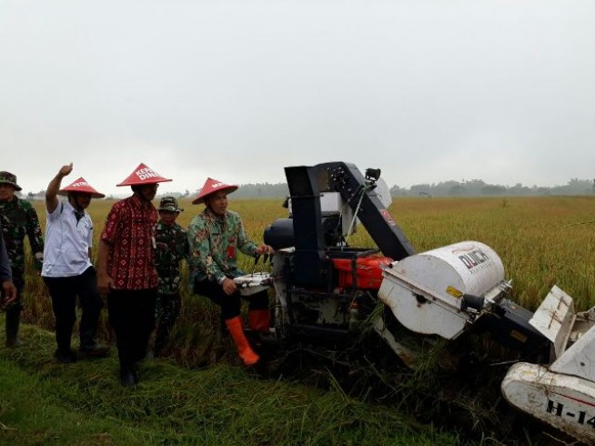 Selain menggelar saresehan, Bupati Joko Sutopo juga melaukan panen perdana menggunakan sarana panen moderen bantuan dari pemerintah. Foto: Tulus PE
