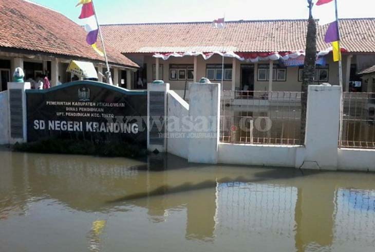KAJEN - Banjir rob di Desa Jaruksari, Kecamatan Tirto, Kabupaten Pekalongan, berdampak di bidang pendidikan. Selain akses jalan menuju ke sekolah sulit lantaran banjir rob, pelajar di SDN Kranding di desa ini selama hampir delapan tahun tidak bisa melaksanakan kegiatan rutin upacara bendera setiap Senin. Bahkan, akibat halaman depan dan belakang sekolah ini terendam banjir rob, ratusan pelajar di SD ini kehilangan area untuk bermain dan olahraga.