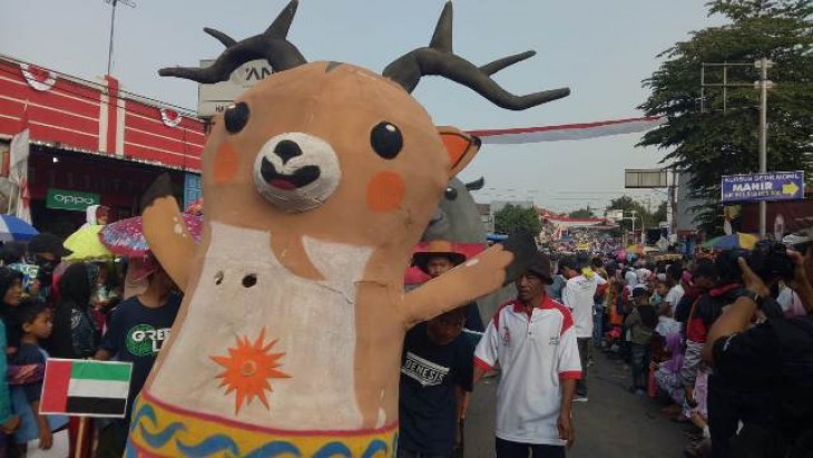 Karnaval 'Agustusan' di Desa Banyuputih, Batang, mengambil tema Asian Games. Salah satunya menampilkan maskot Asian Games dan pernak-perniknya, kemarin. Foto: Hadi Waluyo.