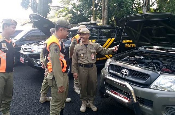 Kepala Satpol PP Wonosobo Haryono mengecek mobil patroli pengamanan lebaran dalam Apel Gelar Pasukan di Sasana Adipura Kencana setempat. Foto : Muharno Zarka