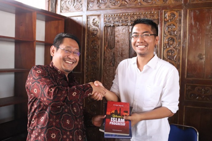 Rektor UMP Dr Anjar Nugroho menyerahkan cinderamata berupa buku kepada Direktur LPPLSH Bangkit Ari Sasongko saat kunjungan ke kantor LSM tersebut, Kamis (13/6). (Foto :Joko Santoso)