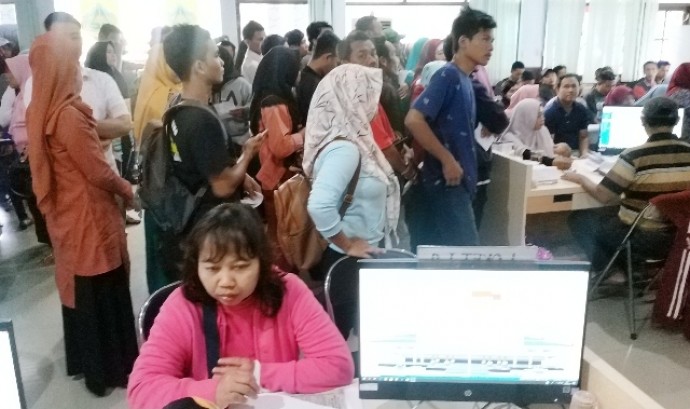 PEMALANG, WAWASANCO - Jumlah pemohon pelayanan data kependudukan di Dinas Kependudukan dan Pencatatan Sipil Kabupaten Pemalang, pasca Hari Raya Idul Fitri hingga saat ini masih membludak, setiap harinya ratusan warga terpaksa harus antre untuk mendapatkan pelayanan. Menurut Kepala Disdukcatpil, Andria Heru Cahyono, terbanyak diajukan adalah surat keterangan permohonan pindah domisili.