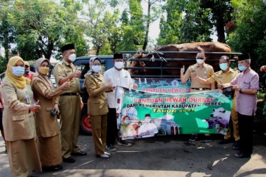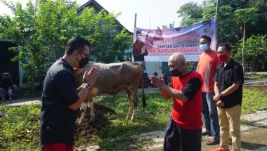 PURBALINGGA, WAWASANCO-Ketua DPRD Kabupaten Purbalingga HR Bambang Irawan menyerahkan satu ekor sapi kurban kepada warga…