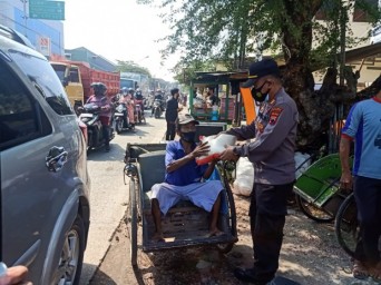 BREBES, WAWASANCO - Polsek Jatibarang, Polres Brebes menyalurkan bantuan sosial (bansos) berupa beras untuk.para pedagang…